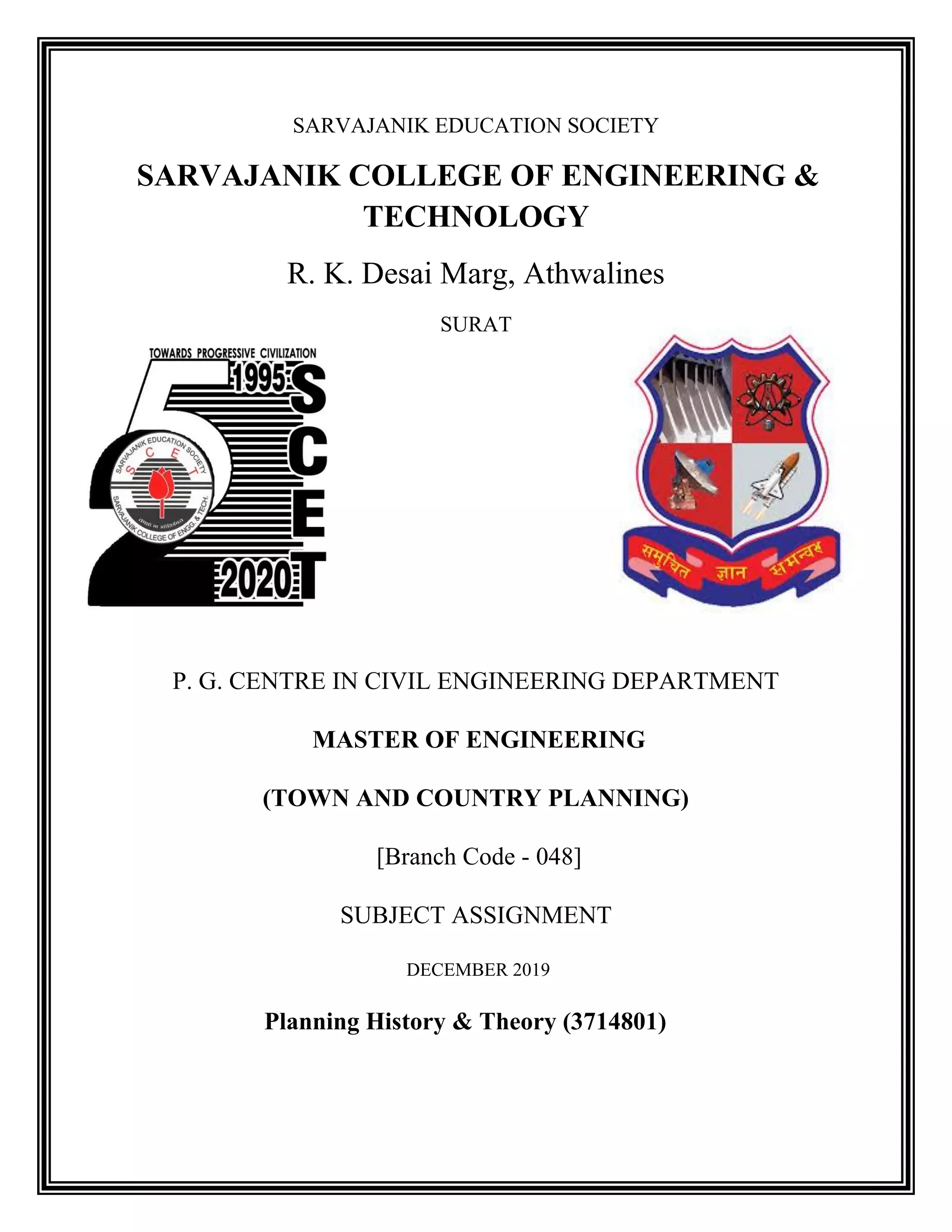 This document is an assignment for a course on Planning History & Theory from Sarvajanik College of Engineering & Technology in Surat, India. It contains 12 questions on topics related to urban planning frameworks, thinkers, the evolution of planning after the industrial revolution, and definitions of key planning terms. The assignment asks students to explain concepts like the urban planning system in India according to URDPFI guidelines, the works of planners like Ebenezer Howard and Le Corbusier, and the effects of industrialization on urbanization and planning.