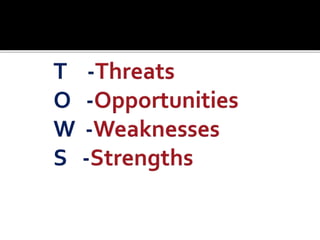 This document discusses various aspects of planning and strategy formulation for organizations. It covers topics like the definition of planning, its benefits, the planning process, setting objectives, and developing strategies. Strategy is defined as determining long term goals and adopting plans to achieve them. The document discusses analyzing the internal and external environment, developing different types of strategies based on strengths, weaknesses, opportunities and threats, and periodically reviewing strategies.