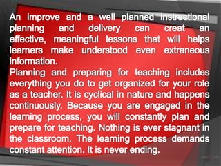 The document discusses instructional planning and delivery. It explains that instructional planning is the process where teachers use appropriate curricula, strategies, and resources to address student needs. It involves deciding what will be taught, how it will be organized, and how learning will be assessed. Instructional delivery is applying instructional strategies to communicate with and engage students around academic content. Effective delivery considers differentiating instruction, using variety, providing cognitive challenge, engaging students, recognizing learning patterns, and asking questions to stimulate thinking.