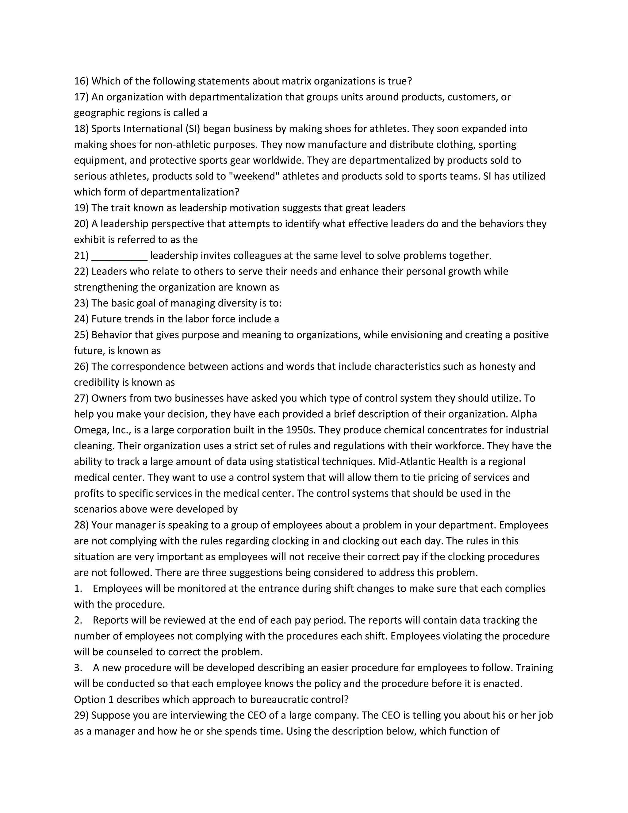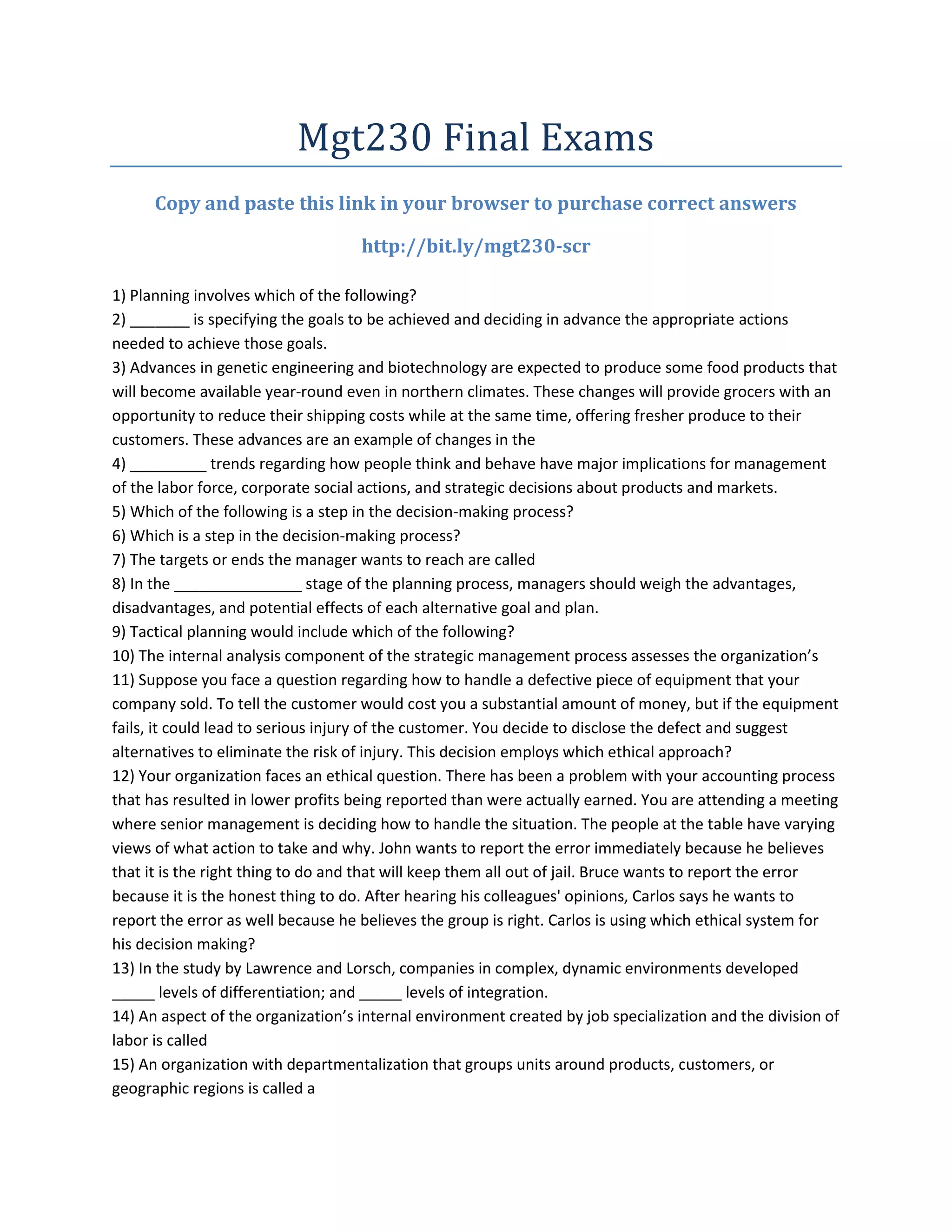This document provides a list of 30 multiple choice questions related to management principles and practices. It also includes a link to purchase the answers to the questions. Some of the questions address topics like planning, decision making, ethics, organizational structure, leadership, and control systems. The purpose is to assist with studying for a final exam in an MGT230 management course.