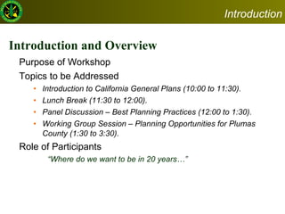 The document provides an overview of planning issues specific to Plumas County and includes: