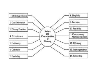 This document discusses the management process of planning. It defines planning as deciding what is to be done, when it is to be done, how it is to be done and who is to do it. Planning is the first function of management and all other functions depend on it. The document outlines the nature, importance, principles, elements/components and steps involved in the planning process. It also discusses different types of planning such as directional, administrative and operational planning.