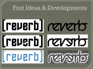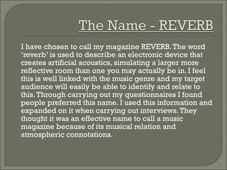The document discusses the development of a music magazine called REVERB. The word "reverb" was chosen as the name because it relates to music and describes the effect of sound reflecting in a room. Research including surveys and interviews found people preferred and understood the name. The document also discusses choosing a font style and color scheme for the magazine based on representing the word "reverb" and relating to the main stories. Examples of potential front page and contents page layouts are presented.