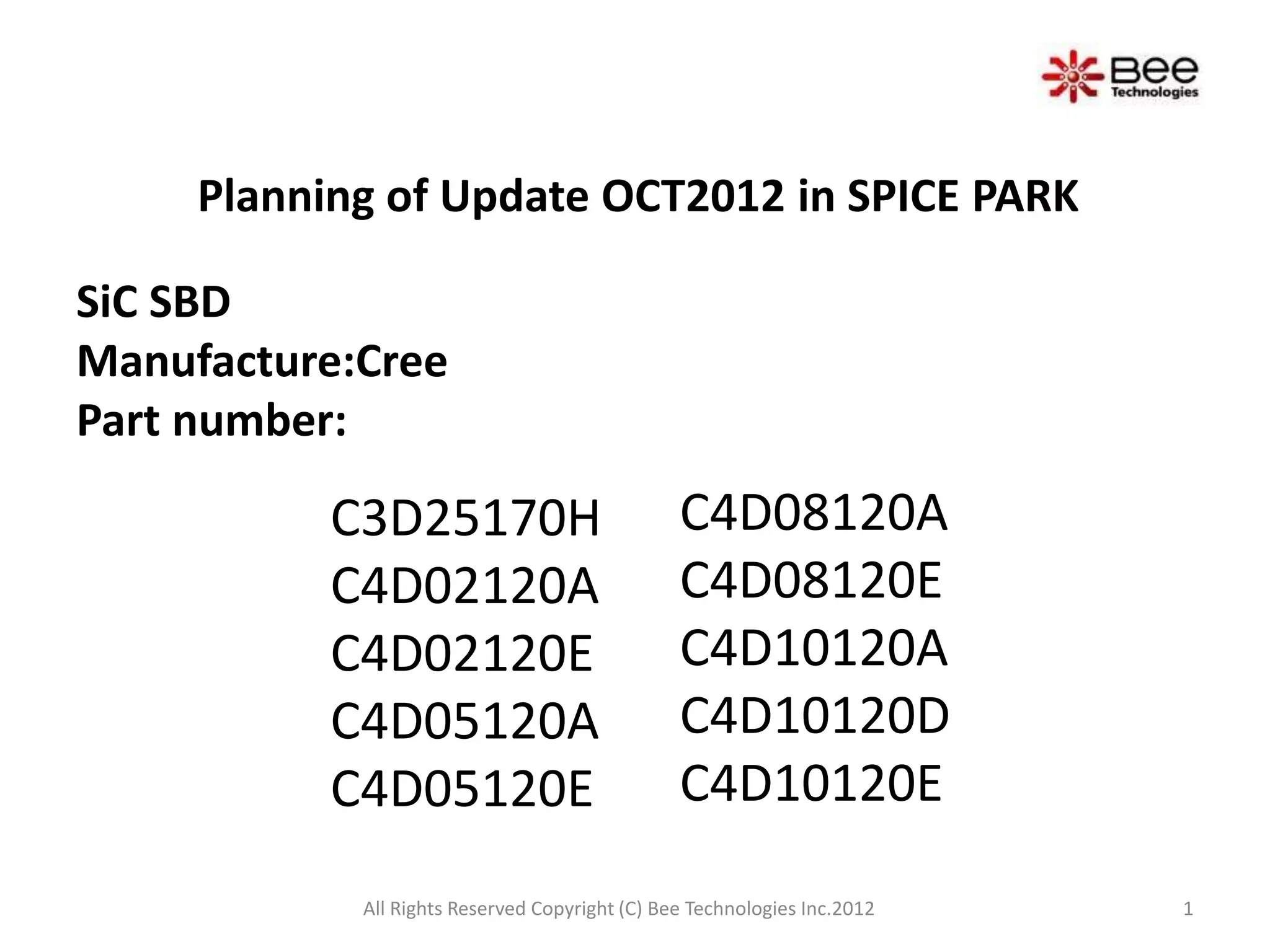 This document provides a list of silicon carbide (SiC) Schottky barrier diodes (SBDs) that will be updated in SPICE PARK in October 2012. It includes 11 part numbers from the manufacturer Cree, including models C3D25170H and versions of C4D02120A, C4D05120A, C4D08120A, and C4D10120A.