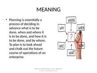 The document defines planning as deciding in advance what is to be done, when, where, how, and by whom to achieve organizational objectives. It provides definitions of planning from various authors, emphasizing it as an intellectual process to anticipate events and map out activities. Planning establishes objectives and finds ways to realize them. Key characteristics are that plans should be based on clear objectives, simple, flexible, balanced, provide performance standards, and be economical and practical. The document outlines different types of plans like purposes, objectives, strategies, policies, procedures, rules, programs and budgets. It also discusses basic principles and steps in the planning process.