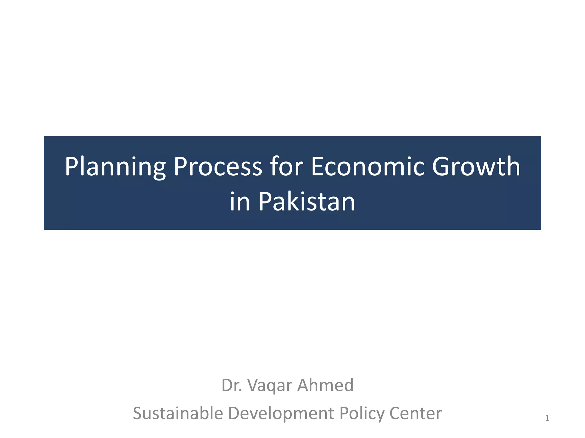 The document discusses Pakistan's economic planning process. It outlines objectives of economic planning such as increasing income and employment while ensuring price stability. It also discusses myths around economic planning and compares Pakistan's model to South Korea's. The planning machinery in Pakistan is described, including the functions of the Planning Commission and the project approval process. Challenges facing economic planning like a contracting public sector development program size are also analyzed.