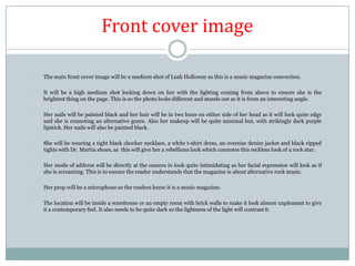 The front cover will feature a photo of Leah Holloway looking edgy in dark makeup and alternative clothing. Coverlines will promote featured artists in stamped text boxes at random angles.