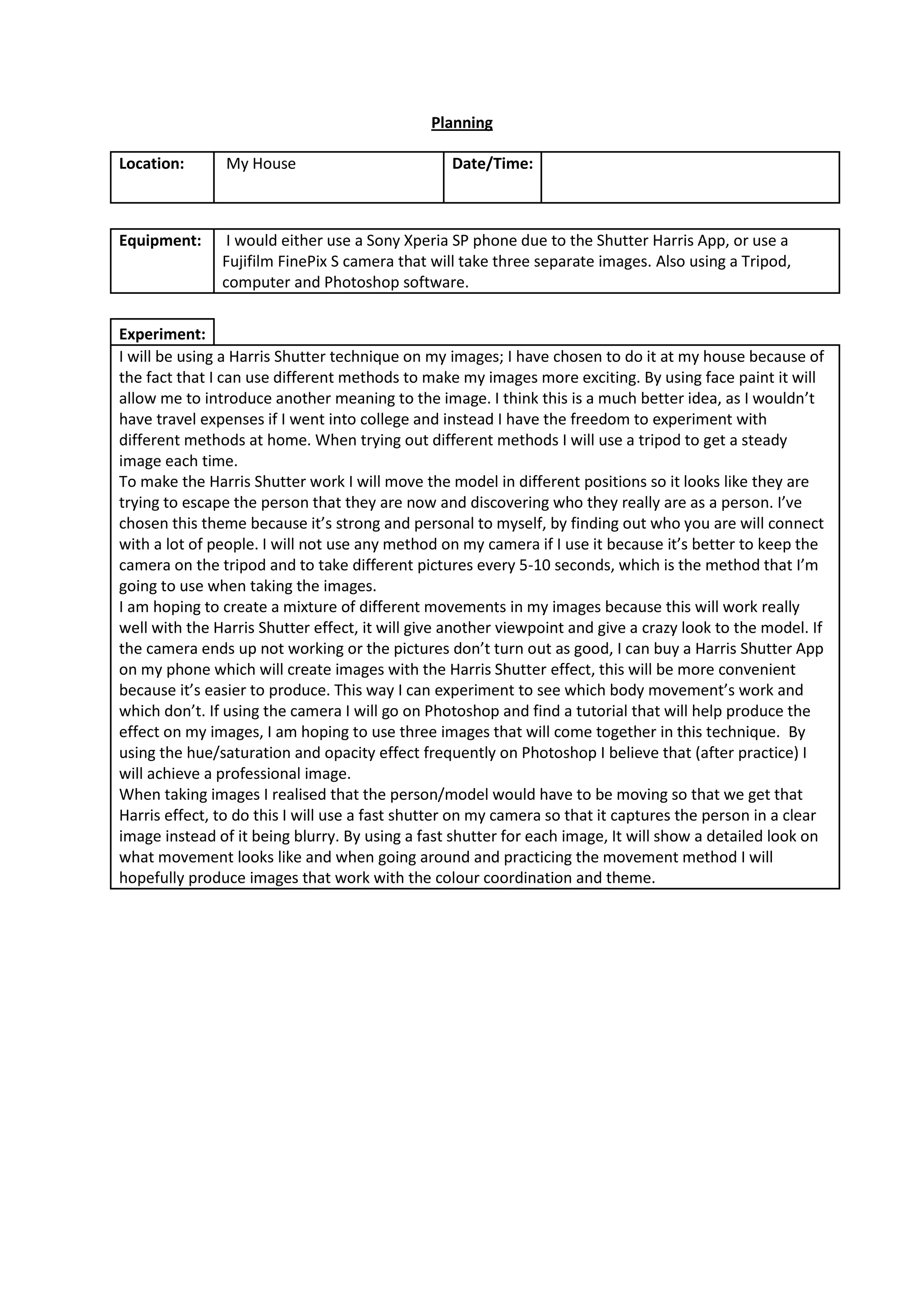 The document outlines a plan to create Harris Shutter effect images at home. The photographer will use either a Sony phone with a Harris Shutter app or a Fujifilm camera on a tripod. Face paint will be used on the model to introduce different meanings in the images as the model moves between positions representing discovering their true self. Different body movements will be tried to see which work best for the effect. Photoshop will be used to combine three images if the camera is used, applying hue/saturation and opacity effects to achieve a professional result.