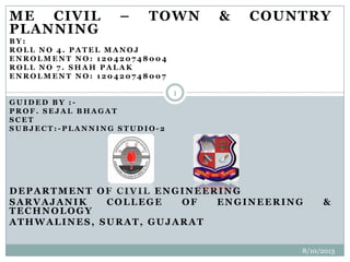 This document summarizes a town planning scheme proposal for an area in Adajan, Surat, Gujarat, India. It includes an analysis of the existing town planning scheme and proposes an alternative scheme. The proposed scheme divides the 79.1 hectare area into residential, road, open space, and public amenity plots. It provides details on the block layout, road widths and costs, reservations for education and recreation, landscape and intersection proposals. The conclusion states that town planning schemes are an effective land management tool that allow for public participation in developing unplanned areas and controlling haphazard urban growth.