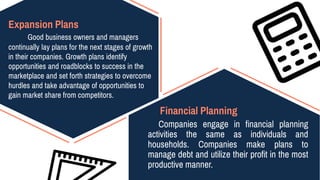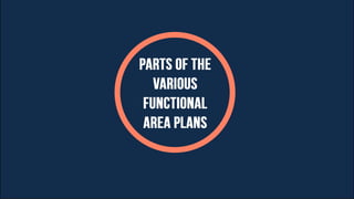 Planning involves determining strategies and tactics to achieve organizational goals. It includes deciding what tasks need to be done, who will do them, where, when, and how as well as the standards to be met. Planning occurs at different management levels and involves setting goals, developing strategies, determining resources, and setting standards. Functional area plans include marketing, production, financial, and human resource plans which have different time horizons and contents. Effective planning requires coordination, communication, and control.
