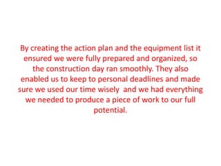 By creating an action plan and equipment list, the document's author was able to plan their production effectively and have everything they needed on the construction day. They conducted research like a questionnaire to understand their target audience's preferences in terms of colors, music, and more. Their chosen artist was Elena Tonra and the song/album was "Took Your Breathe Away." They chose locations like a normal house and park that audiences could relate to for their music video narrative about different kinds of love. Through planning with flat plans and storyboards, the author was fully organized to create a work that followed conventions and appealed to their target audience.