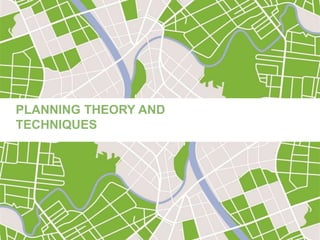 The document discusses various concepts and principles related to planning theory and techniques. It defines planning as a future-oriented and cyclic process of identifying options, assessing options, developing strategies and goals, implementing plans, and evaluating impacts. It also discusses different types of planning like physical, economic, strategic, regional, urban, rural and land use planning. Key principles of town planning discussed include providing housing and amenities for all, reserving open spaces, and controlling growth through green belts. Physical planning and its aims of enhancing social and economic needs while safeguarding resources are also summarized.