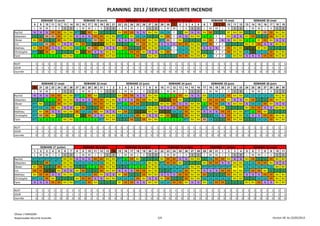 This document is a planning schedule for the fire safety service for 2013. It assigns each staff member (Rachid, Sebastien, Olivier, Eric, Mathieu, Christophe, and Yann) to different night and day shifts throughout the year on a weekly basis. The schedule covers weeks 49-52 of 2012 and weeks 1-14 of 2013.