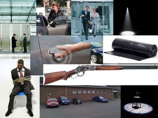 The document outlines plans for an opening film sequence involving three characters: two antagonists and one victim. The antagonists have been dealing drugs but one decides to leave with the organization's money. When the others find out, they go looking to kill him. Scenes include close-ups of shoes, a gun, and a man sitting, as well as longer shots of the men walking and driving away in a car to a parking garage. Costumes for the antagonists will include black suits, ties, shoes and hats to portray them as gangsters and fit with the gangster film genre.