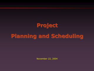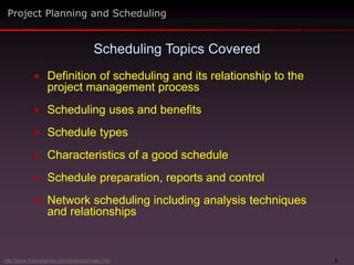 The document discusses project planning and scheduling. It covers key topics like defining scheduling and its relationship to project management, the types and benefits of schedules, characteristics of a good schedule, and the process of schedule preparation, reporting and control. Specifically, it outlines a 10 step process for preparing a reliable project schedule, including identifying activities, developing a network diagram, estimating durations, performing forward and backward passes to determine start/finish dates and identify the critical path, and producing a final schedule for review and distribution.