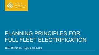 The WRI webinar on August 29, 2023, focused on planning principles for full fleet electrification, highlighting lessons learned from research on public purpose fleets. Key discussions included barriers to electrification, the importance of utility engagement, and strategies for effective site planning and infrastructure development. The session featured insights from experts and aimed at guiding organizations in successfully transitioning to electric vehicle fleets.