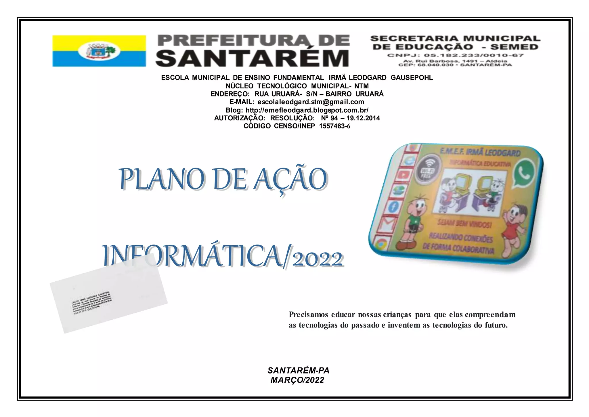 This document provides information about the Escola Municipal de Ensino Fundamental Irmã Leodgard Gausepohl school in Santarém, Brazil. It details the school's address, authorization, number of students and teachers, goals for the 2022 school year including a focus on socioemotional support and gradual return to in-person learning. It also outlines the mission, goals and activities of the school's technology laboratory, which aims to support teachers' use of technology and promote digital literacy among students.