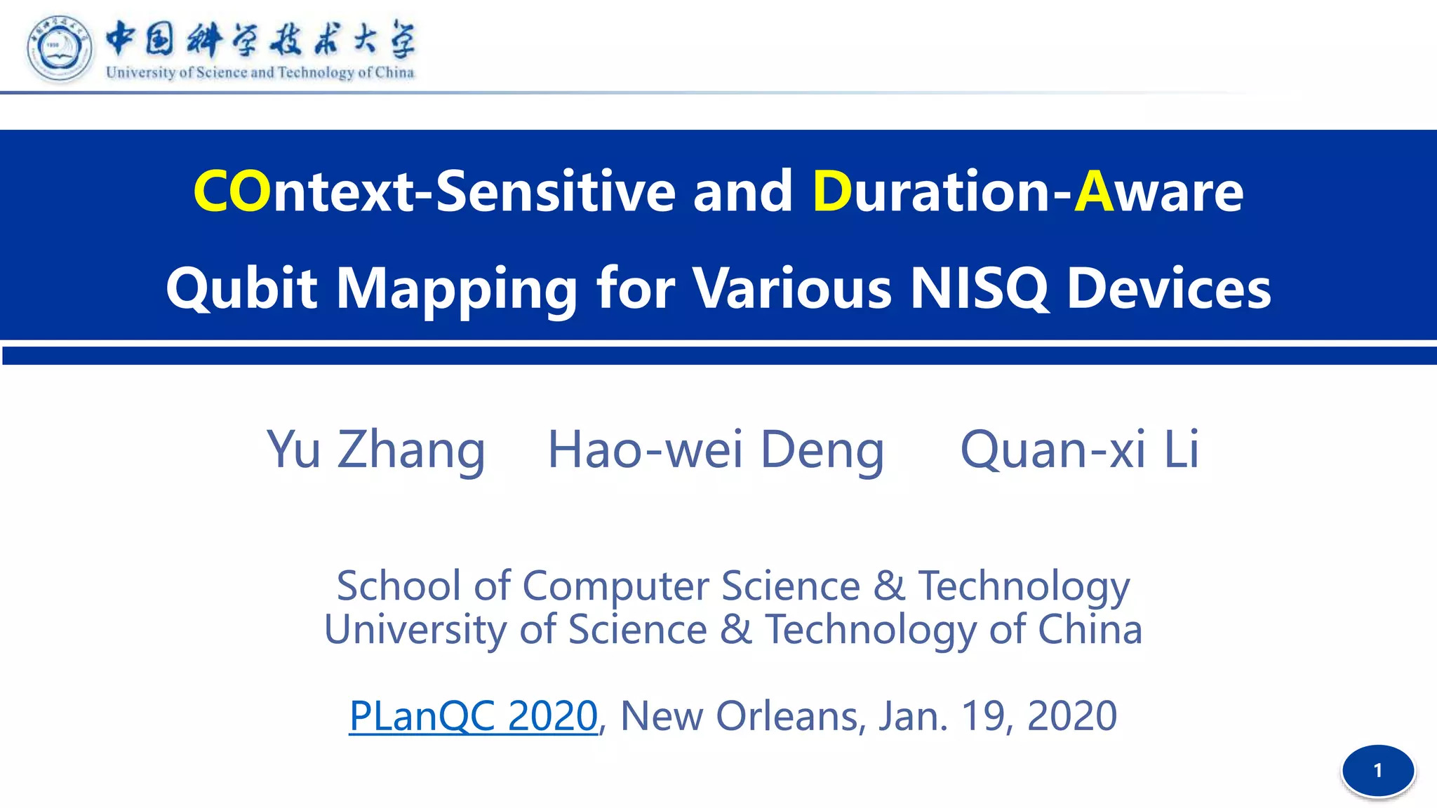 The document discusses a context-sensitive and duration-aware qubit mapping algorithm called Codar for various NISQ devices, aiming to optimize quantum circuits by addressing qubit connection limitations and gate duration differences. It presents a comparative evaluation of Codar's performance across several architectures, showing significant speedup ratios in executing quantum algorithms. Additionally, the document outlines ongoing research efforts focusing on noise effects and high-level algorithmic patterns.