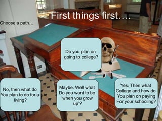 This document provides guidance on how to organize your thoughts and develop an answer to the common question "What are your plans after high school?". It recommends choosing a college path including potential colleges and majors, developing a budget to account for tuition and living expenses, selecting a career path and backup options related to your major, and planning for independent living after college. The overall document is meant to help structure thinking about next steps after high school.