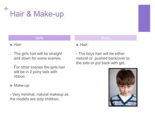 The document outlines plans for a spring clothing line photo shoot featuring boys and girls models. It details the hair, makeup, outfits, props, location, lighting, and shot types that will be used. For the girls, the outfits include dresses, skirts, and cardigans. The boys will wear shorts, jeans, and shirts. Props for the girls include purses and heels, while the boys will use sports items. Photography will take place in a studio against white or pink backgrounds using natural sunlight lighting. Shots will include close-ups, long shots, and different angles.