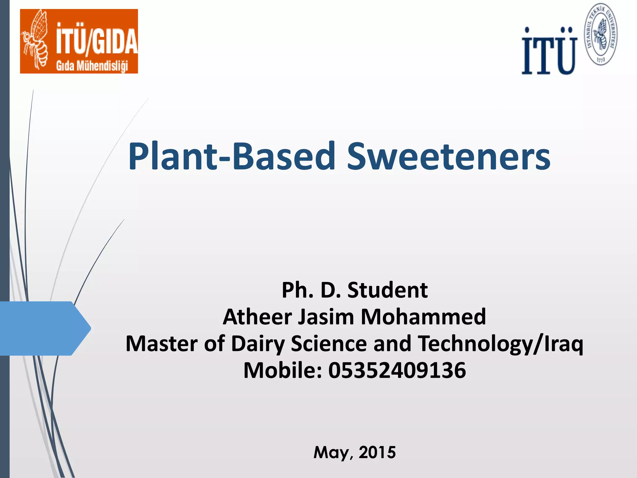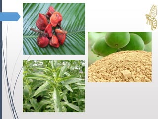 The document discusses various plant-based high-potency sweeteners. It provides details on the source plant, chemical structure, sensory properties, and applications of several sweeteners including stevia (Stevia rebaudiana), thaumatin (Thaumatococcus daniellii), lo han guo (morgroside from Siraitia grosvenorii), and others. For each sweetener, the document outlines where the plant is found, how it is used, its sensory properties like sweetness intensity and taste profile, stability, safety studies and regulatory approvals.