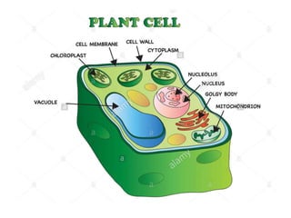 Plant cells contain a cell wall, chloroplasts, and large vacuoles which are their key identifying features. The cell wall provides structure and support to the plant cell. Chloroplasts allow the plant cell to perform photosynthesis by capturing sunlight. Large vacuoles store water, nutrients, and waste products in the plant cell.
