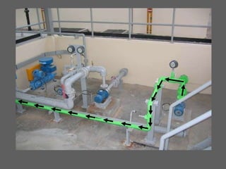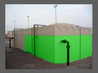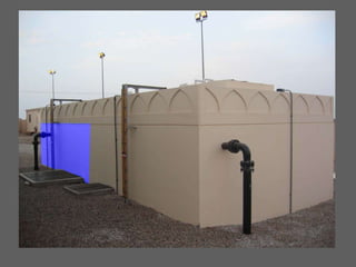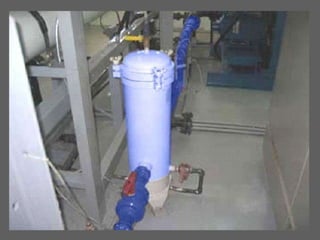 The document summarizes the key components of a water treatment plant that uses reverse osmosis (RO) technology. It describes the process flow from the raw water intake through various filtration and pumping stages to the RO modules and storage of the filtered permeate water. The main components discussed include raw water and filtrate tanks, multi-media and cartridge filters, high pressure pumps, RO pressure vessels, permeate storage tanks, and associated piping and instrumentation.