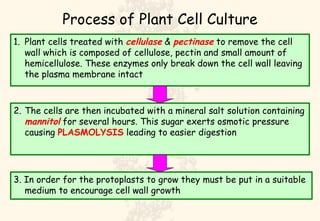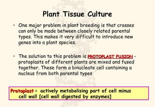 ![Plant Tissue Culture One major problem in plant breeding is that crosses can only be made between closely related parental types. This makes it very difficult to introduce new genes into a plant species. The solution to this problem is PROTOPLAST FUSION - protoplasts of different plants are mixed and fused together. These form a binucleate cell containing a nucleus from both parental types Protoplast = actively metabolising part of cell minus cell wall [cell wall digested by enzymes]](https://image.slidesharecdn.com/plant-culture-27654/85/Plant-Culture-1-320.jpg)
