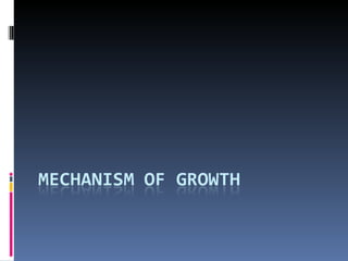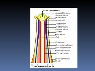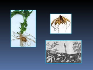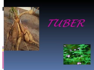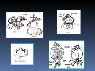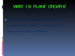 Plant growth and development occurs through various processes. Leaves grow from leaf primordia in the shoot apical meristem and develop through unfolding of the leaf blade. Roots grow from the root apical meristem through cell division and differentiation. Stems provide support and transport of water and nutrients through primary growth in length and secondary growth in thickness. Tubers are storage and reproductive structures that develop from thickened stems or roots. Plant growth is driven by mechanisms like seed germination, photosynthesis, and plant hormones that regulate cell division and expansion.