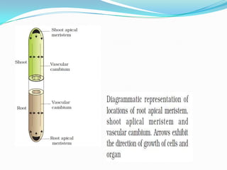 Growth and development in plants involves three main processes: cell division (growth), cell enlargement, and cell differentiation (development). Growth leads to an increase in size and mass through these cellular processes. Development refers to the changes plants undergo throughout their lifecycle from germination through maturation and reproduction. Key events include shoot and root development, flowering and fruit production, before senescence. Hormones and environmental factors influence the pathways and rates of growth and development.