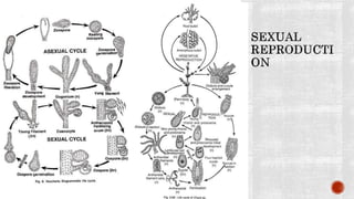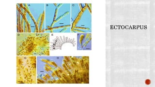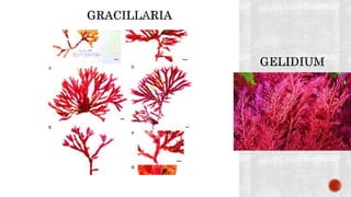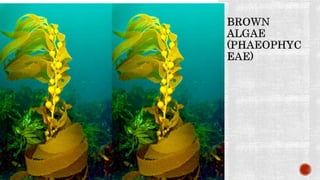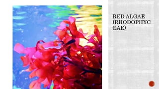 The document discusses the characteristics and classifications of the kingdom Plantae, focusing on various groups of algae including chlorophyta, phaeophyta, and rhodophyta. It details their nutritional modes, reproductive strategies, ecological roles, and economic importance, including uses in food, industry, and medicine. Additionally, it highlights the structural features, habitats, and adaptations of different algal species.