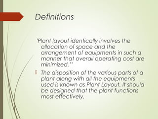 Plant layout involves the strategic arrangement of equipment and space to minimize operating costs, enhance safety, and improve efficiency. There are different types of layouts, including product, process, and fixed layouts, each with distinct advantages and disadvantages based on the nature of production. The development of an effective layout depends on prior decisions regarding location, capacity, and manufacturing methods.