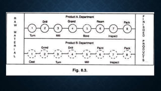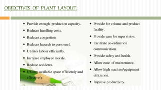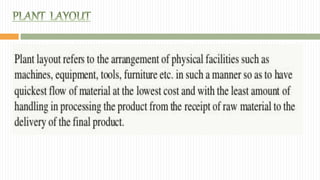 Plant layout refers to the physical arrangement of equipment, machinery, workstations, and space in a manufacturing facility. The key types of layouts discussed are process layout, product layout, mixed layout, fixed layout, and group technology layout. Process layout groups similar processes together while product layout arranges machinery in a linear flow. Group technology layout clusters machines by part families to reduce setup times and material handling. Flexible manufacturing systems apply group technology and automation to allow production of different product styles simultaneously on the same system.
