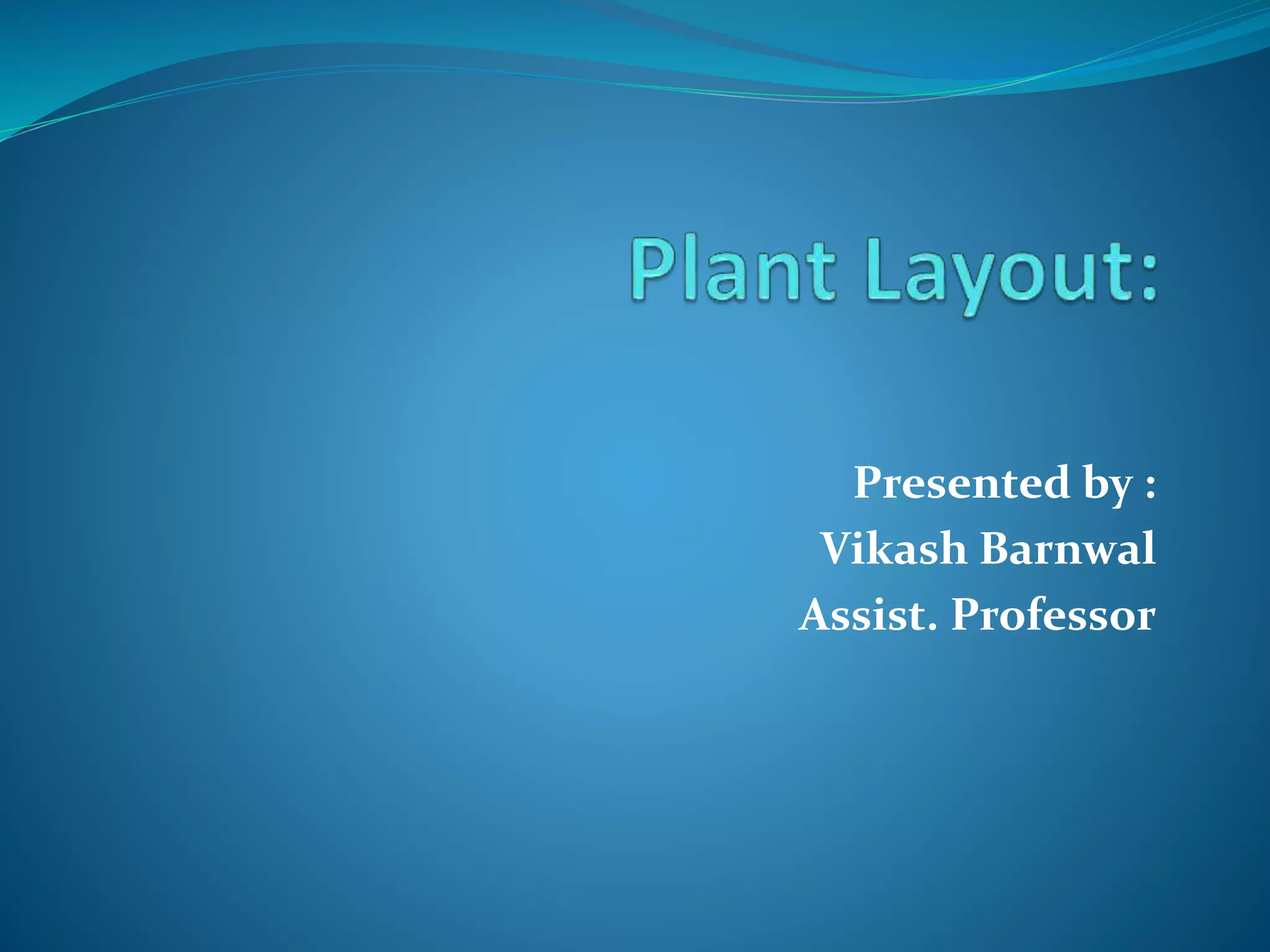 Plant layout refers to the arrangement of machines, materials, personnel and supporting services within a manufacturing facility. The objectives of plant layout include streamlining material flow, minimizing handling, maintaining process balance, and maximizing space and employee efficiency. There are four main types of layouts: product layout arranges machines in linear sequence to produce a single product; process layout groups similar machines together; combination layout blends aspects of product and process; and fixed position layout keeps large products stationary while bringing materials and machines to them. The document discusses the characteristics and suitability of each layout type.