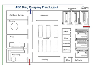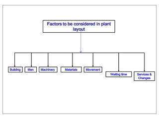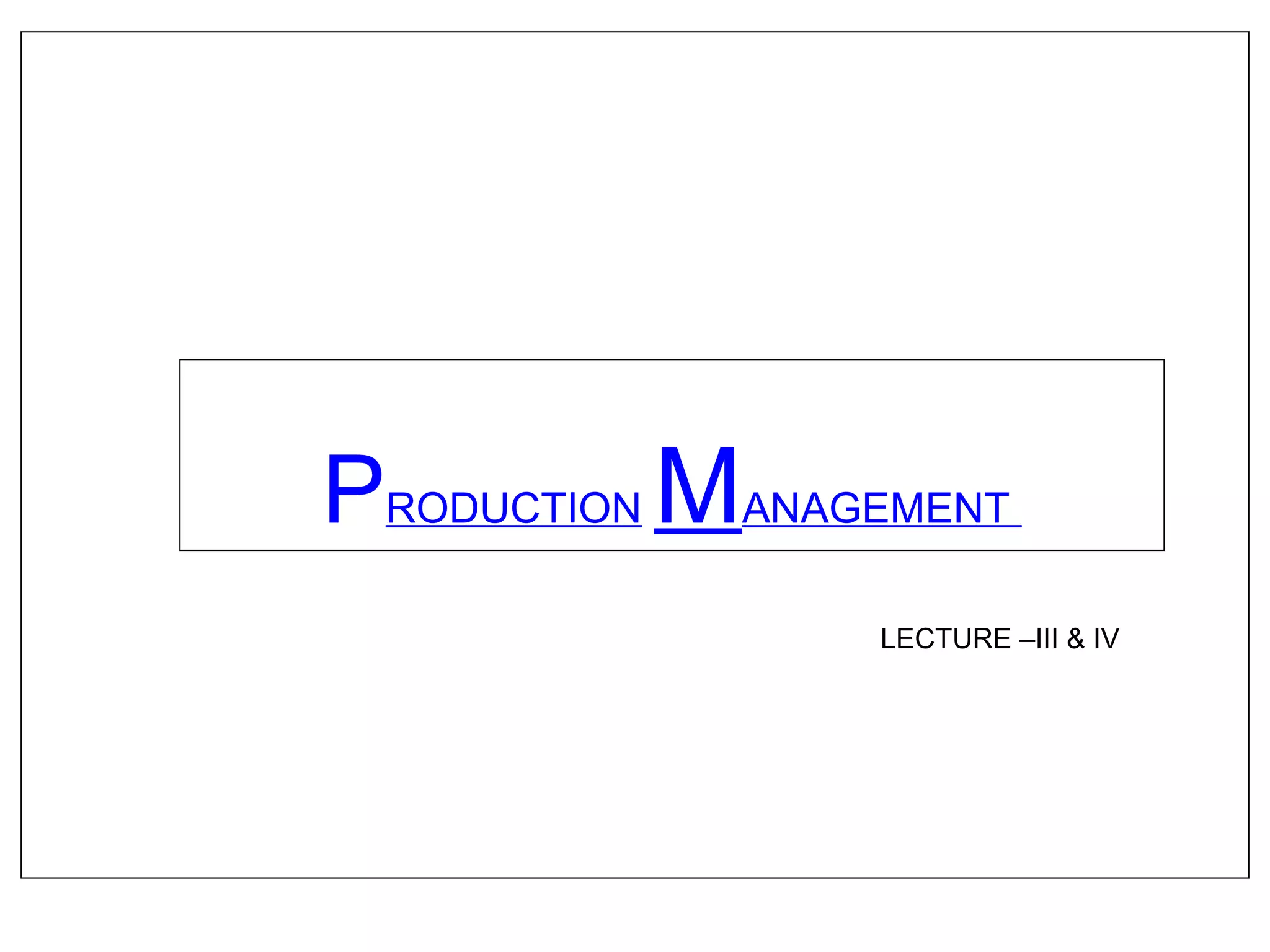 The document discusses various topics related to production management including plant layouts, material handling, inventory management, and quality control. It provides definitions and objectives of plant layouts and describes the main types of layouts - functional layout, line layout, static product layout, group layout, and combination layout. Factors influencing layout decisions and tools for plant layout design such as process charts, flow diagrams, and machine data cards are also covered.