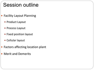 The document discusses various types of plant layouts including product, process, fixed-position, and cellular layouts, detailing their characteristics, advantages, and disadvantages. It emphasizes the importance of efficient layout planning to enhance industrial productivity, minimize costs, and ensure safety. Additionally, it highlights factors influencing layout decisions such as management policies, plant location, product nature, production volume, and space availability.