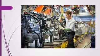 The document discusses plant layout in production management, defining it as the arrangement of machinery and facilities for efficient material flow and cost reduction. It outlines the objectives of effective layouts, including increased productivity and safety, and reviews various layout types such as product, process, combination, and fixed position layouts, each with its advantages and disadvantages. Additionally, it covers the significance of material handling, transportation devices, and various equipment like conveyors and forklifts in optimizing production processes.