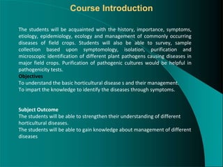 This document provides an introduction to the fundamentals of plant pathology. It discusses key topics including the definition of plant pathology, objectives of plant pathology such as studying the causes and mechanisms of disease, epidemiology, and disease control. It also defines important terminology like pathogen, disease, symptoms, and host. The document outlines the classification of plant diseases and different types of causal agents like fungi, bacteria, viruses. It highlights the importance of plant pathology in reducing crop losses and ensuring food security.
