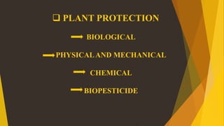 The document outlines various methods of plant protection against pests, including biological, mechanical, physical, and chemical control strategies. Biological control involves using natural enemies of pests, while mechanical control includes trapping and barriers. Chemical control focuses on the use of pesticides, with an emphasis on biopesticides derived from living organisms, detailing various preparations and applications to combat specific pests.