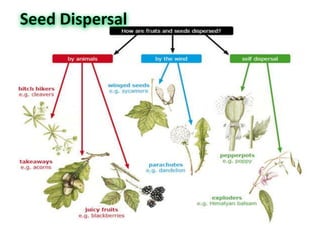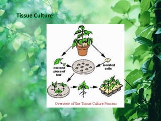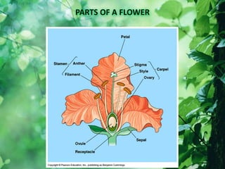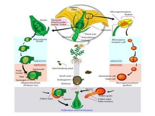 The document discusses plant reproduction, including both asexual and sexual reproduction. Asexual reproduction occurs through vegetative propagation using specialized structures like rhizomes, bulbs, corms, runners, and tubers. It can also occur artificially through methods like cuttings, grafting, and tissue culture. Sexual reproduction involves the fusion of male and female sex cells during pollination and fertilization. It takes place through the flowers of angiosperms and requires male stamens and female carpels. Offspring from sexual reproduction exhibit genetic variation unlike the clones from asexual reproduction.