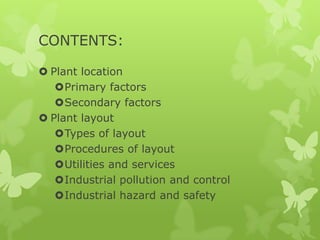 The document discusses factors to consider when selecting a plant location and designing the layout for a pharmaceutical formulation production facility. Key factors for location include raw materials, markets, energy/utilities, transportation, and labor. The plant layout should group similar processes together and allow for logical product flow. Utilities like power, water, waste disposal must also be properly planned to meet production needs. Overall plant location and layout are vital decisions that strongly influence business success.