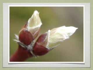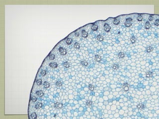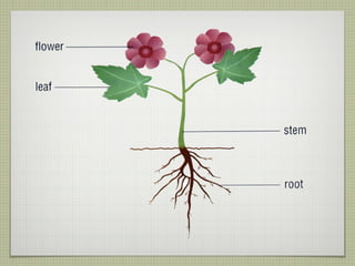 The document discusses the structures and functions of plant roots, stems, and leaves. It explains that plants have either taproots or fibrous roots, and that roots absorb water and minerals. The stem transports water and nutrients throughout the plant and has nodes, buds, and vascular bundles. Leaves undergo photosynthesis to produce sugars for the plant.