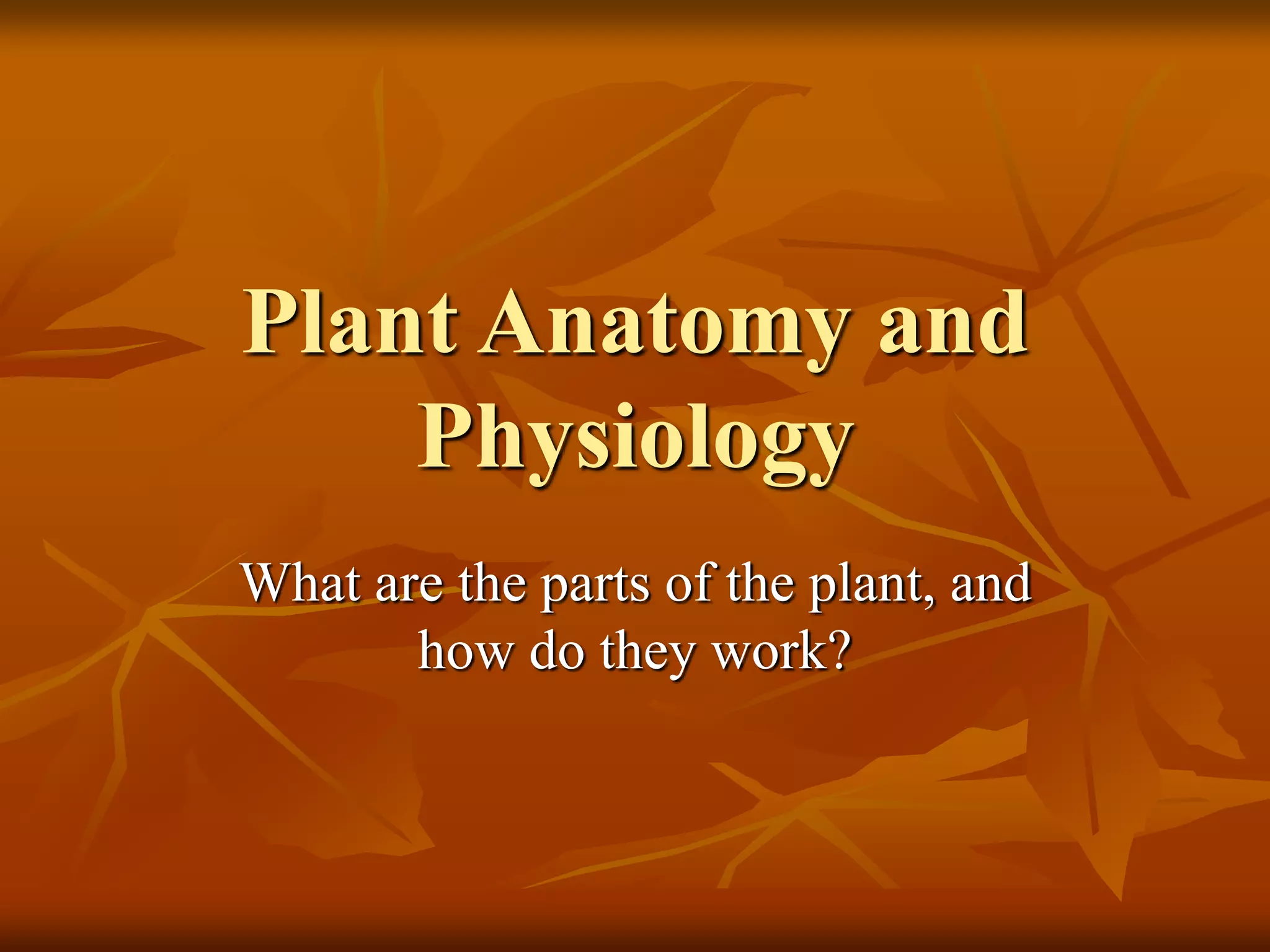 This document provides an overview of plant anatomy and physiology, covering the major plant parts and their functions, plant classification, sexual reproduction in plants, photosynthesis, respiration, environmental factors like light, temperature, water, and plant growth regulators. It describes the root system, stem structures and transport tissues, leaf anatomy, flower parts, and defines key terms.