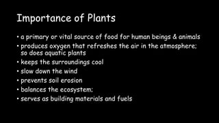 Plants are important as they produce oxygen, food, building materials and more. They obtain energy through photosynthesis using sunlight, carbon dioxide and water. Plants are classified based on characteristics like habitat and whether they are woody or non-woody. A plant's growth is influenced by internal factors like hormones and external environmental factors like temperature, light and climate. Farmers must understand these factors to successfully grow crops.