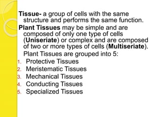 The document provides a comprehensive overview of plant tissues, categorizing them into five types: protective, meristematic, mechanical, conducting, and specialized tissues. It details the various functions and characteristics of these tissues, as well as their roles in plant anatomy, including root, stem, and leaf morphology. Additionally, it discusses modifications in roots and stems for storage, support, and reproduction.