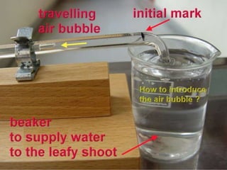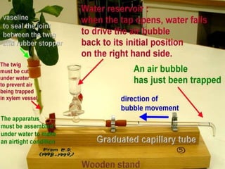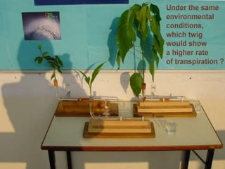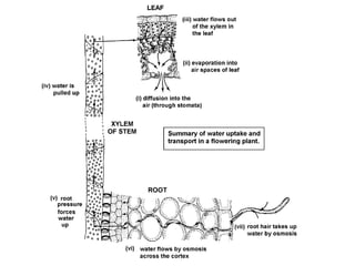Plant transport systems include xylem and phloem. Xylem transports water and minerals upwards from roots to shoots passively, using no energy. Phloem transports food such as sucrose horizontally throughout the plant using energy from ATP. Xylem vessels are located towards the edges of stems to resist bending forces, while located centrally in roots to withstand stretching. Transpiration is the evaporation of water from plant leaves, powered by the transpiration stream which replaces lost water. Transpiration cools plants and transports minerals upwards from roots.