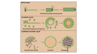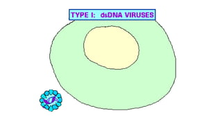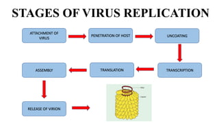 The document discusses the stages of virus replication including attachment, penetration, uncoating, transcription, translation, genome replication, assembly, and release. It details specific mechanisms and processes involved, such as viral interaction with host cells, the role of viral RNA polymerase in transcription, and how viruses assemble and release new virions. Additionally, it highlights the replication process of double-stranded DNA viruses.