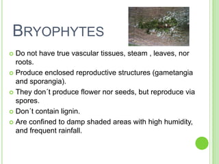 This document summarizes four plant divisions: bryophytes, pteridophytes, gymnosperms, and angiosperms. It provides key details about each division, including their reproductive structures, uses, and interactions with other organisms. Bryophytes do not have true roots or vascular tissue and reproduce via spores. Pteridophytes are vascular plants that reproduce via spores. Gymnosperms reproduce via naked seeds while angiosperms reproduce via enclosed seeds within fruits. The document also gives examples of economic uses for these plant groups and types of symbiotic relationships they engage in.
