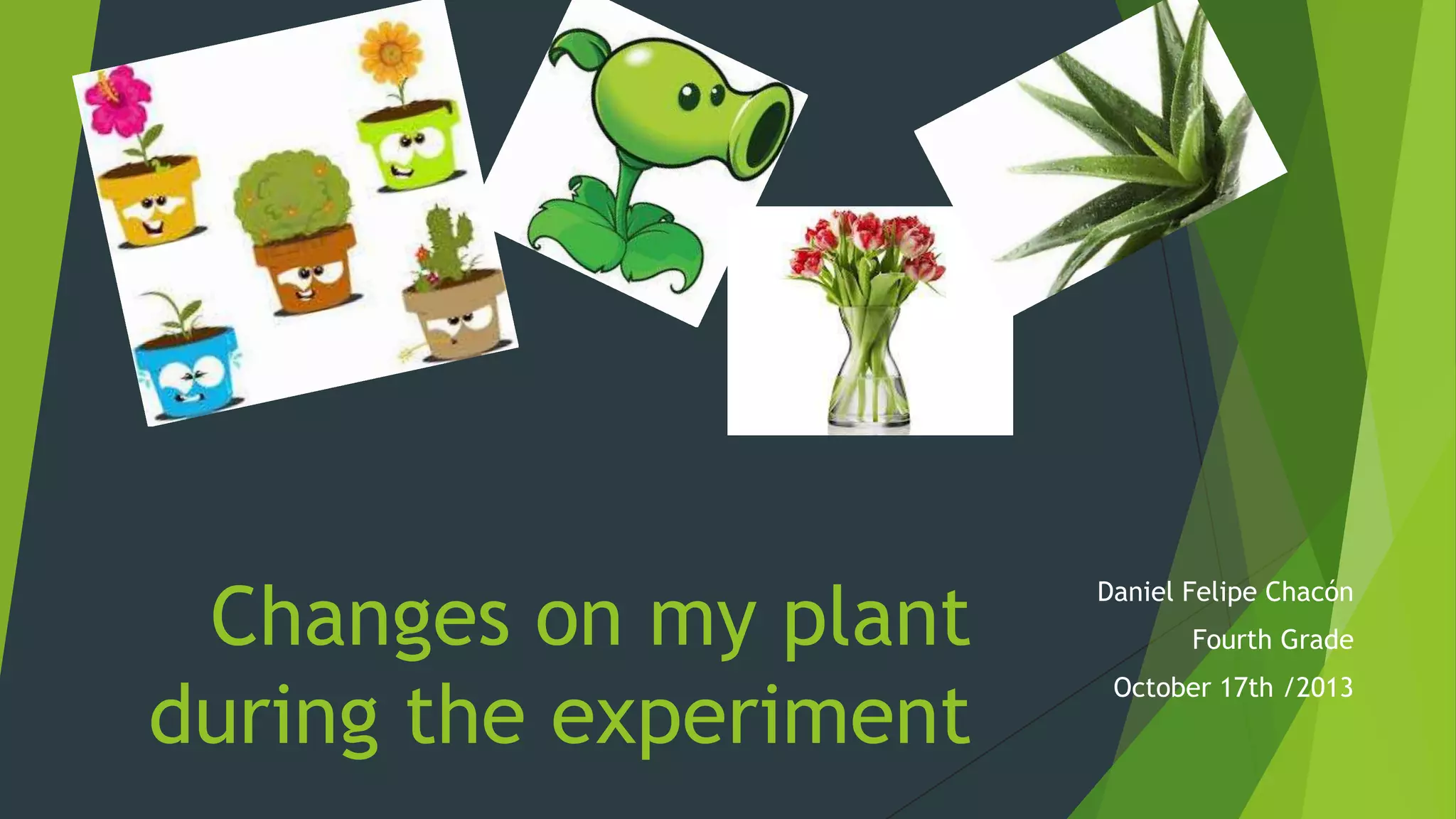 Plant 1 received clean water, 24 hours of light, quiet music, and 15 minutes of radiation. Plant 2 received dirty water, no light, loud music, and 30 minutes of radiation. Plant 3 received rain water, sunlight, no music, and no radiation. The radiation caused some leaves on plant 2 to wilt and die, while it had no effect on plant 1. Plant 1 grew more than plant 2 under the different light and music conditions. Plant 3 grew normally under the conditions it received. The student learned that applying changes to plants can have positive or negative effects, and that plants require care and responsibility like pets.