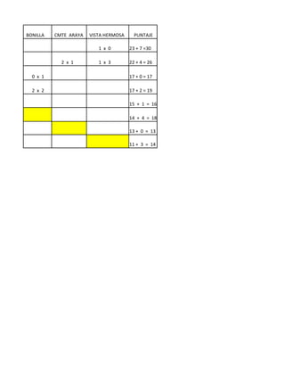 The document shows soccer match results between 7 teams - Los Rieles, Bellavista 3, Estrellas Unidas, Araucarias, Los Pinos, Bonilla, and CMTE Araya. It lists the number of wins and losses each team had against the other teams, as well as their total scores which are calculated by adding their goals for and against. Bonilla had the highest total score.